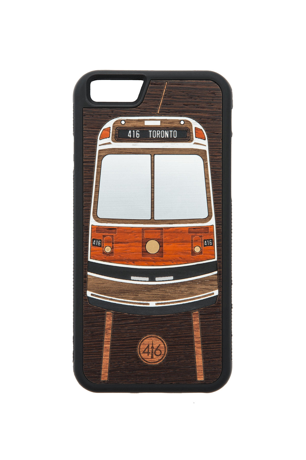 This one of a kind phone case was hand crafted using natural wood. It is an exact replica of a Toronto Streetcar. The case features an assortment of wood, laser cut inlays, and a flexible rubber shell.
